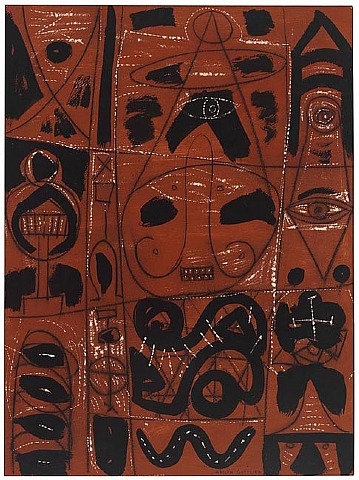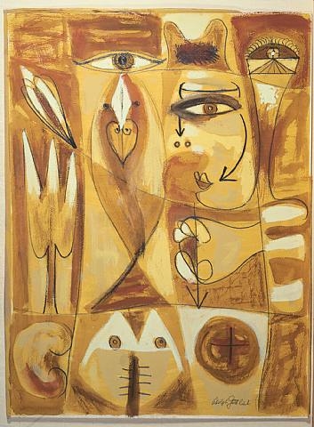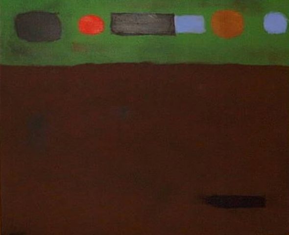 In Arizona, his subject matter changed as he became concerned with the natural forms that would continue to mark all of his subsequent work. A feeling of isolation prompted his return to New York in 1939 and from there he went to Gloucester where he began to paint beach still-lives in three-dimensional boxes set against deeply receding spaces. He soon abandoned this form, but these experiments led to his pictographs of the forties-stylized motifs based on human and natural forms isolated in compartments. For Gottlieb the pictographs were his adaptation of Surrealist automatism-the result of free association. Later, he would reduce these pictographs to an increasingly basic structure: the grid. The next step occurred in a painting divided into two parts: in the lower section he placed the interwoven lines of a grid; on top of this he drew a horizon line above which floated five areas of colour in varying geometric shapes. This was the first of a series to be known as ‘Imaginary Landscapes’.