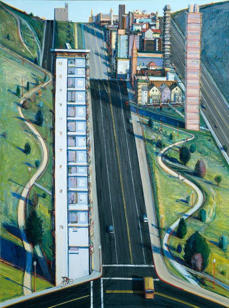 Pausing here to note the similarity between Diebenkorn's San Francisco landscape of 1963 (above) and those of Wayne Thiebaud. The one below is Thiebaud's 'Down 18th Street' from 1980.