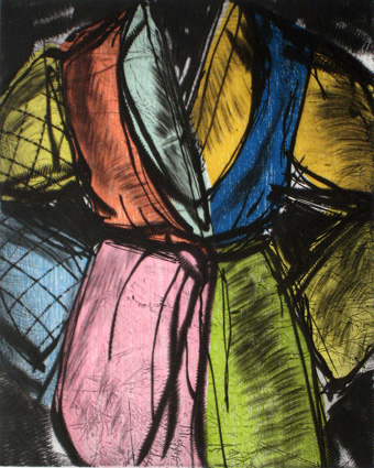Over his career Jim Dine has produced many series of works focused on certain subject matter, tools, bathrobes and hearts amongst them. Dine began painting bathrobes in 1964; though some were titled or subtitled Self-Portrait. The bathrobe became a motif in his repertoire which he has returned to on many occasions, in prints as well as paintings. Though he claimed never to wear a bathrobe, nonetheless it is an article of collective faith that these are all, in a way, self-portraits.