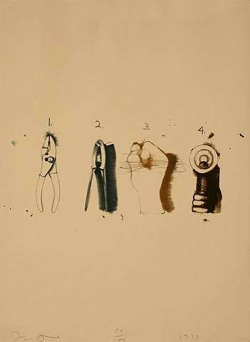 Like other pop artists, Dine incorporated images of everyday objects in his art, but he diverged from the coldness and impersonal nature of pop art by making works that fused personal passions and everyday experiences. His repeated use of familiar and personally significant objects, such as a robe, hands, tools, and hearts, are signature icons in his art. In his early work, Dine created mostly assemblages in which he attached actual objects to his painted canvases, as in Shoes Walking on My Brain (1960). From 1959 to 1960, Dine also was a pioneer of happenings, works of art that took the form of theatrical events or demonstrations.
