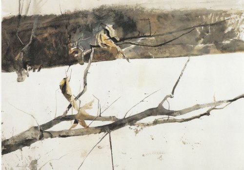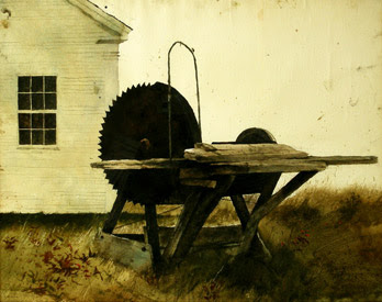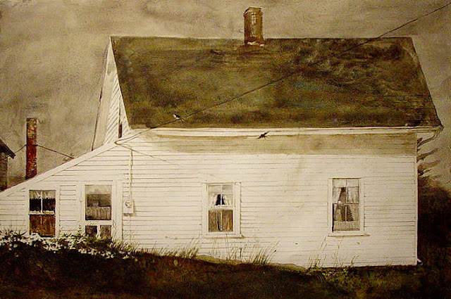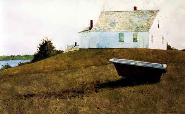 In my second post about the American artist dynasty of the Wyeth family I am featuring the best known, Andrew Wyeth. In my last post I looked at the illustration work of his father, N. C. Wyeth. Andrew Wyeth (1917 – 2009) is best known for his detailed tempera paintings of people in the north-eastern landscape around his hometown of Chadds Ford, Pennsylvania, and at his summer home in Cushing, Maine. I actually prefer the freshness and immediacy of his watercolours. These are big, bold watercolours done as ever in a muted palette. I first came across them at the Lefevre Gallery in London in the 1970's.