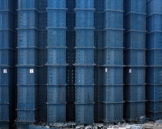 Some of the structures in the series are photographed without reference to the context of sky or ground, and many buildings are seen in a state of repair or construction: their walls covered with a grid of scaffolding or the soft coloured curtains that protect the streets below from falling debris. From a distance, such elements become a part of the photograph's intricate design.