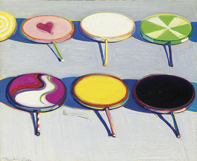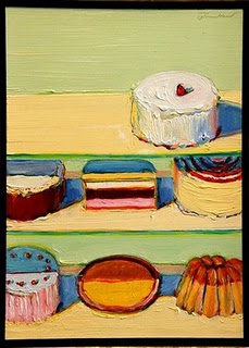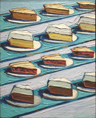 Personally my favourites are his landscapes, often painted as if seen from an aeroplane, they feature sinuous rivers, lakes and crop patterns, all rendered in his delicious ice-cream palette. The first post shows his cakes (and the odd hot dog or sweet), painted in his typically sensuous, impasto brushwork, and again the delicious colours making the cakes seem both tangible and edible.
