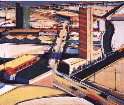 For the second of my posts on Wayne Thiebaud (For more biographical detail see the previous post) I am showing some of his landscape paintings. In 1963, Thiebaud turned increasingly to figure and landscape painting. Beginning in the 1970s, he began painting San Francisco cityscapes, wildly distorted views of the city's streets and hillsides that are reminiscent not only of Richard Diebenkorn's cityscapes from the mid-sixties but also the Precisionist paintings of Charles Sheeler and Georgia O'Keefe (for his cityscapes see my next post). His most recent landscapes dating from the mid-1990s share many of the same spatial and planar distortions seen in the cityscapes but utilise hotter colour and flattened planes to create the imagery.