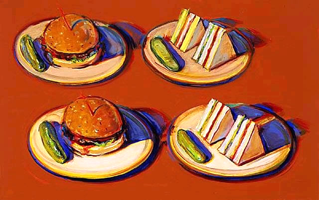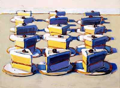 Thiebaud is best known for his iconic still-lifes foods and products, such as cakes, pies, sandwiches, cosmetics, and toys. He is also celebrated for his vertiginous San Francisco cityscapes and his richly hued views of Northern California. Because his subject matter varies in this way I’m actually going to put up three successive posts on his work featuring cakes, landscapes, and cityscapes.