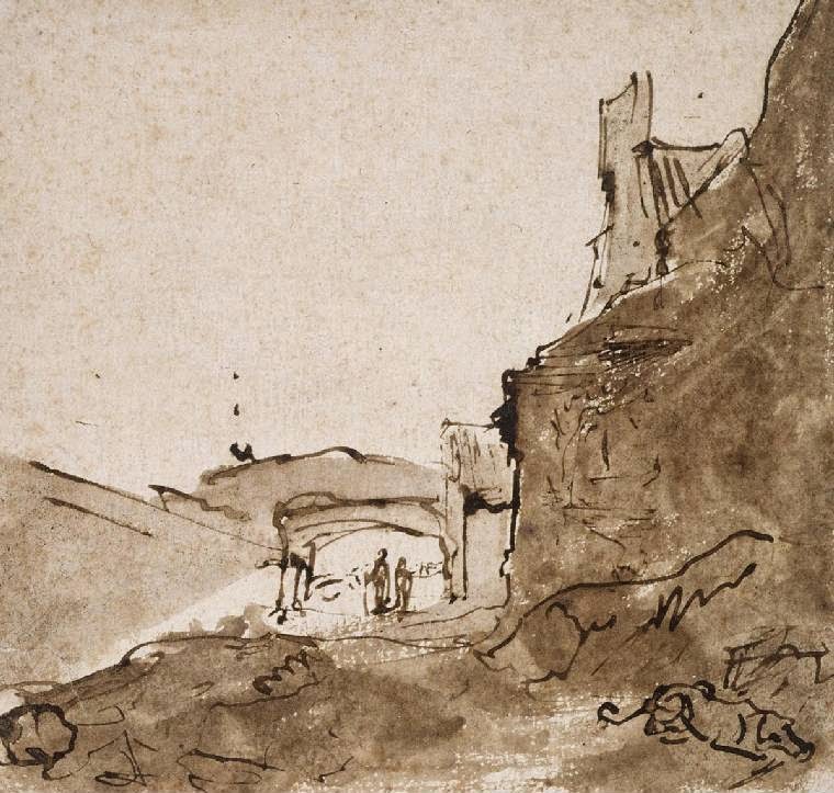 | Rembrandt 1627-28 Outskirts of a Town with Walls and a Doorway pen and indian ink and brown wash on paper 15.2 x 14.3 cm Fitzwilliam Museum, Cambridge, UK |