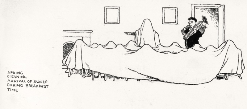 | Spring Cleaning - Arrival of Sweep During Breakfast Time pen and ink 7 x 16.5 cm |
