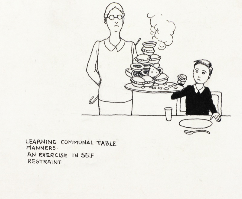 | Carrying on in the Dining Room During Spring Cleaning in a Communal Establishment pen and ink 10.8 x 38.7 cm |