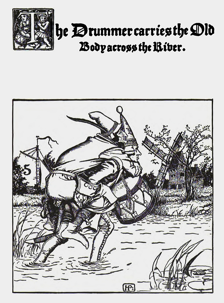 | King Stork The Drummer carries the Old Body across the River. |