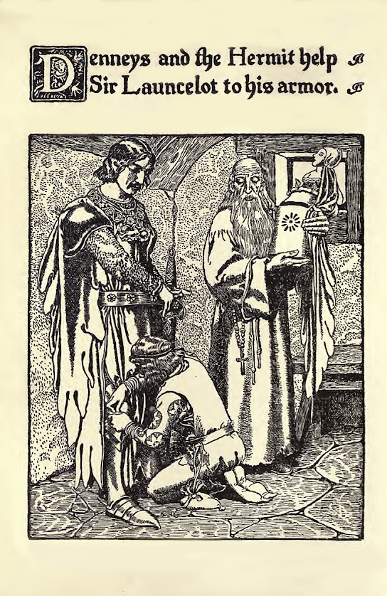 | The Story of Sir Launcelot and His Companions "Denneys and the Hermit help Sir Launcelot to his armor." |