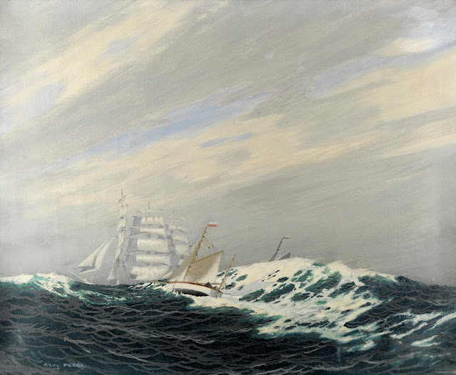 Charles Pears (1873-1958) was a marine painter and lithographer, born at Pontefract, Yorkshire. Pears worked initially as a black-and-white artist for magazines from the late 1890s, serving as a theatrical caricaturist for Pick-Me-Up. During World War I he was an Official War Artist for the Admiralty, a position he repeated during World War II, and he gradually established a reputation as a sound marine painter with a strong sense of design. He was founder and first president of the RSMA and his work found its way into the National Maritime Museum, Greenwich, and the Imperial War Museum. However, as a versatile draughtsman he also did many posters and illustrated Lewis Carroll’s Alice’s Adventures in Wonderland, 1922, and the works of Charles Dickens. He wrote a number of books, such as From the Thames to the Seine, 1910, and South Coast Cruising from the Thames to Penzance, 1931.He exhibited widely, including the RA, ROI and Fine Art Society. He lived in St. Mawes, Cornwall.