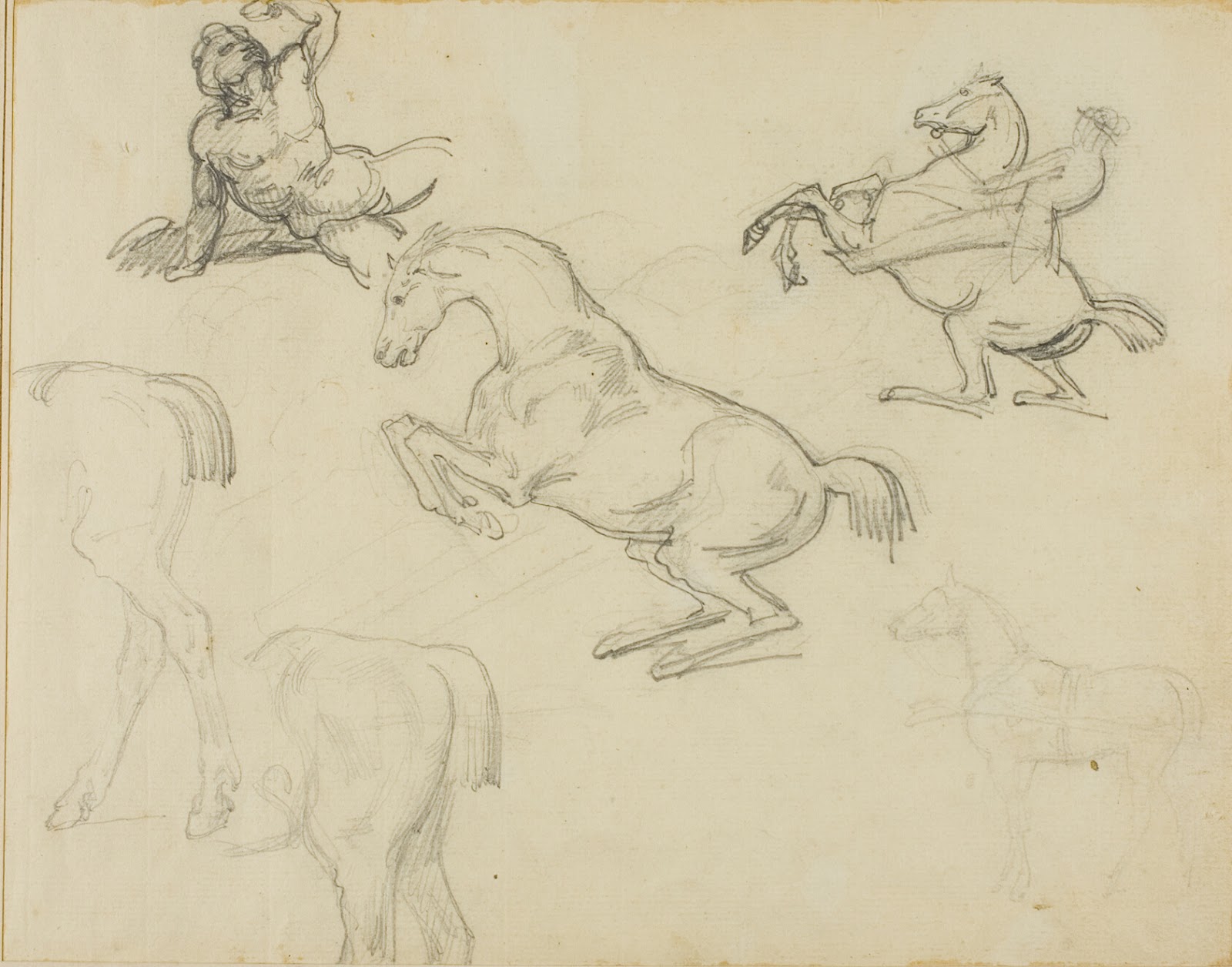 | 1818-19 Sketches: Reclining nude, a horseman and various horses graphite, on cream laid paper, perimeter mounted on cream wove paper 22.4 x 28.3 cm Art Institute of Chicago, IL |